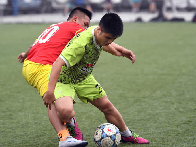 Đội bóng FC Công an Tân Triều (màu áo hồng) giao lưu với FC Quân sự (màu áo tím) trước đó.