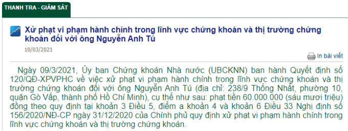 Ngày 10/3/2021, Ủy ban Chứng khoán Nhà nước phát đi thông báo xử phạt vi phạm hành chính đối với ông Nguyễn Anh Tú.