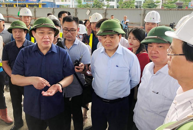 Bí thư Thành ủy Hà Nội Vương Đình Huệ và Chủ tịch UBND TP Hà Nội Nguyễn Đức Chung kiểm tra hiện trường dự án