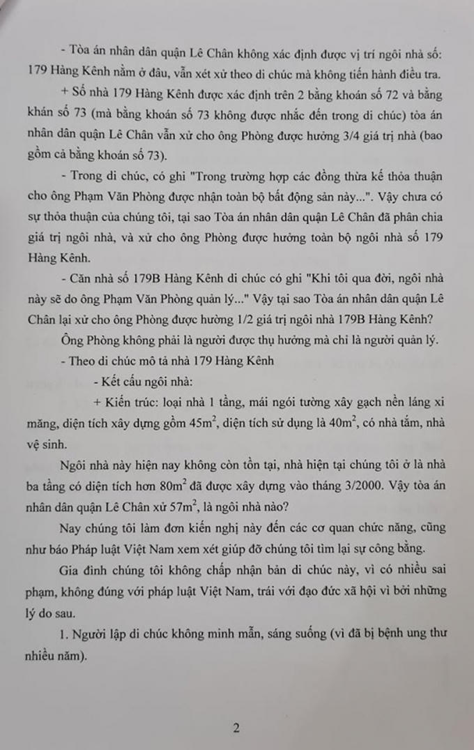 "Mặt khác, căn nhà số 179B Hàng Kênh di chúc có ghi "Khi tôi qua đời, ngồi nhà này sẽ do ông Phạm Văn Phòng quản lý...". Như vậy ông Phòng chỉ là người quản lý, không phải là người thụ hưởng, tại sao toà án nhân dận quận Lê Chân lại xử cho ông Phòng được hưởng 1/2 giá trị ngồi nhà 179B Hàng Kênh?", người đứng đơn kiến nghị đặt câu hỏi.