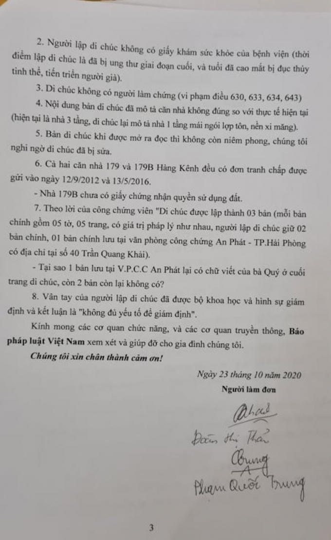 Bên cạnh đó, nội dung bản di chúc đã mô tả căn nhà không đúng so với thực tế (hiện tại là nhà 3 tầng, di chúc lại miêu tả nhà 1 tầng mái ngói lợp tôn, nền xi măng). Theo nội dung đơn nêu thì bản di chúc khi được mở ra đọc thì không còn niêm phong, chúng tôi nghi ngờ di chúc đã được sửa. Đồng thời, cả hai căn nhà 179 và 179B Hàng Kênh đều có đơn tranh chấp được gửi vào ngày 12/9/2012 và 13/5/2016 và nhà 179B chưa có giấy chứng nhận quyền sử dụng đất.