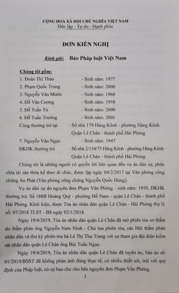 Theo nội dung đơn thư, bà Thảo đưa ra quan điểm “Ngày 19/4/2019 TAND quận Lê Chân đã mở phiên toà xét xử sơ thẩm vụ án tranh chấp thừa kế tài sản và tuyên án với bản án số 01/2019/BSST đã không phản ánh đúng thực tế, có nhiều thiếu xót và trái với quy định của pháp luật".