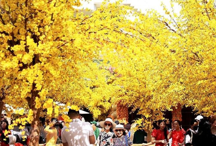 Người dân và du khách tham quan, trải nghiệm không gian mai vàng giữa trung tâm Thành phố Hồ Chí Minh ngày 29 Tết. (Ảnh: Hồng Đạt/TTXVN)