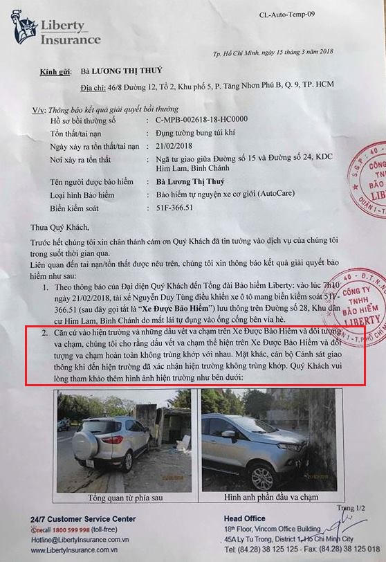 Theo hồ sơ thể hiện, ngày 15/3/2018, chị Thúy nhận được văn bản do Bảo hiểm Liberty gửi thông báo kết quả giải quyết bồi thường. Văn bản trên cho biết, vụ tai nạn có dấu vết hiện trường không trùng khớp, “xác định hiện trường không đúng” nên không được giải quyết bồi thường.