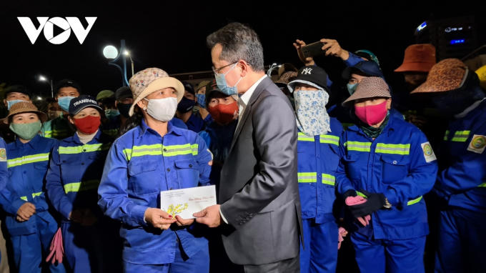 Ông Nguyễn Văn Quảng, Bí thư Thành ủy Đà Nẵng tặng quà công nhân môi trường đô thị.