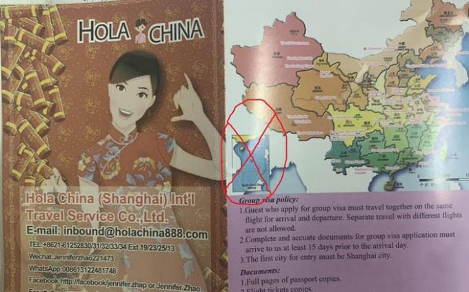 Ấn phẩm của công ty Hola China có in hình "Đường lưỡi bò" được mang đến quảng bá tour du lịch tại Hội chợ du lịch quốc tế TP Hồ Chí Minh hồi tháng 9/2019. Ảnh: Hoàng Tuyết.