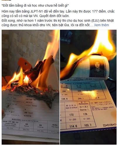 Trước đó, trên trang cá nhân của mình, bạn Đ.T.H cũng đã tuyên bố sẽ đốt hai tấm bằng tiếng Nhật của mình với chủ điểm “Đốt tấm bằng đi và học như chưa hề biết gì. Mình quyết định đốt nó vì muốn truyền tải một thông điệp là “hãy học vì sự phát triển của bản thân”, đừng vì giới hạn nào đó mà hạn chế khả năng của mình”- Đ.T. H chia sẻ.