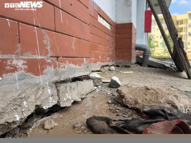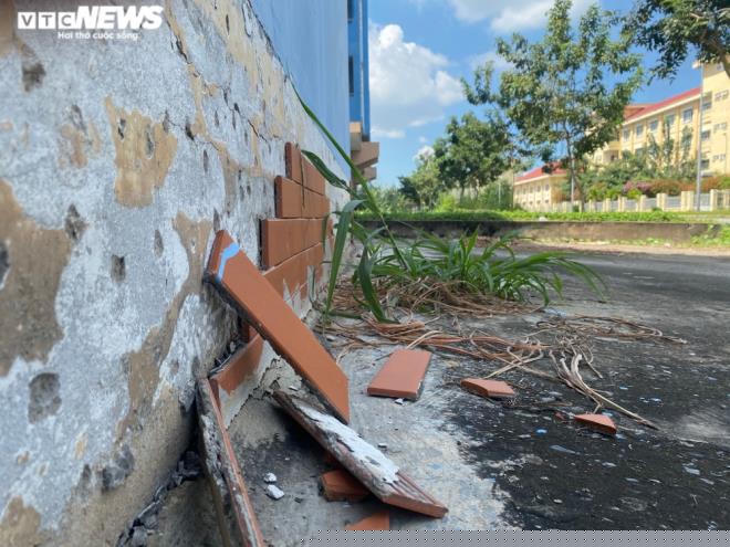 Gạch ốp chân tường xung quanh các toà nhà bong tróc, rơi vung vãi khắp nơi.