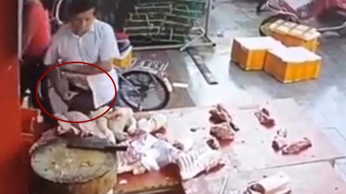 Người đàn ông nhặt lấy một miếng thịt bỏ vào túi quần.