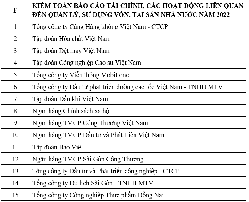 Ngoài ra, Kiểm toán Nhà nước sẽ lựa chọn một số tập đoàn, tổng công ty nhà nước có quy mô lớn như Tập đoàn Dầu khí, Tập đoàn Dệt may, Tập đoàn công nghiệp Cao su, Tổng công ty Cảng hàng không Việt Nam;… để kiểm toán báo cáo tài chính, các hoạt động liên quan đến quản lý, sử dụng vốn, tài sản nhà nuớc năm 2022.