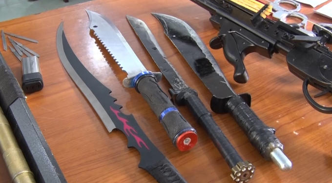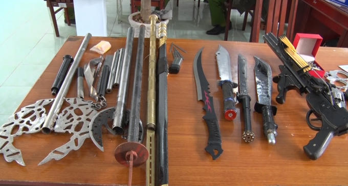 Tang vật thu giữ gồm: 5 bịch ma túy đá, 9 viên thuốc lắc, 3 khẩu súng bắn đạn bi và chì, 4 cây kiếm và mã tấu.