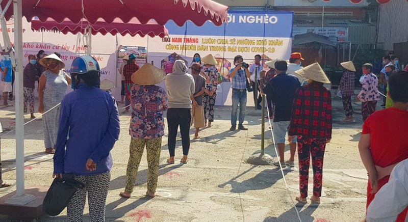 Người dân nghèo xếp hàng, giữ đúng khoảng cách đến lấy gạo.