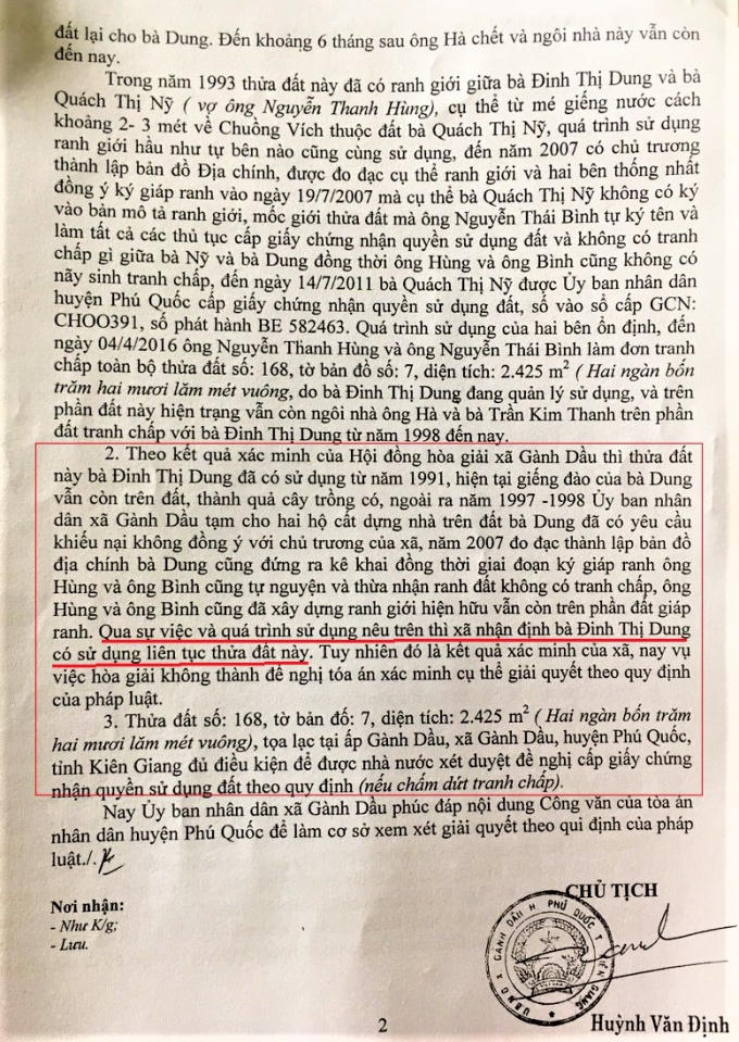 Sau đó vụ việc đã được UBND xã Gành Dầu tiến hành xác minh và tổ chức hòa giải với kết quả nhận định là bà Đinh Thị Dung đã sử dụng ổn định phần đất này không có tranh chấp với ai.