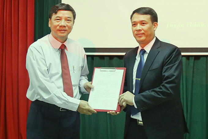 | Đồng chí Nguyễn Hữu Quất trao quyết định cho đồng chí Nguyễn Mạnh Hùng. |