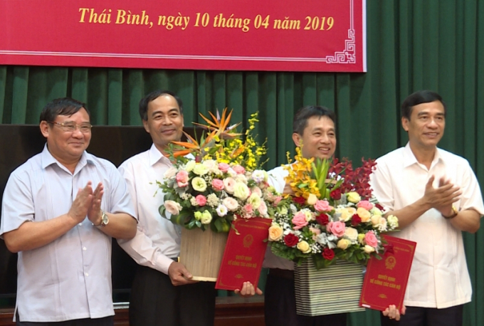 | Lãnh đạo tỉnh Thái Bình trao quyết định và chúc mừng đồng chí Nguyễn Thanh Tuyền, Trần Hồng Sơn. |