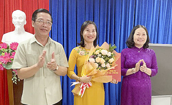 | Lãnh đạo Tỉnh ủy Bà Rịa - Vũng Tàu trao quyết định và chúc mừng đồng chí Lê Thị Kim Thu. |
