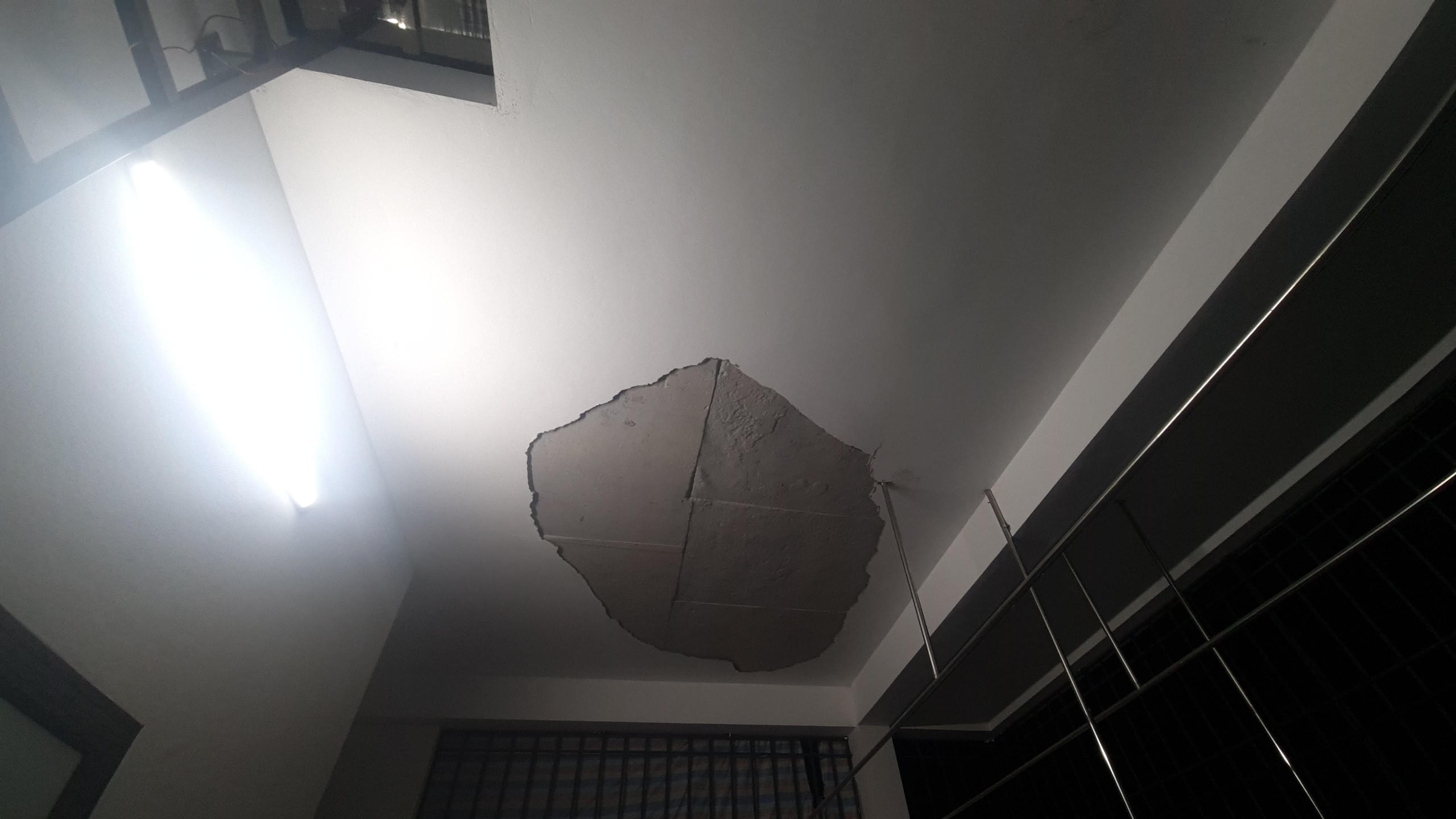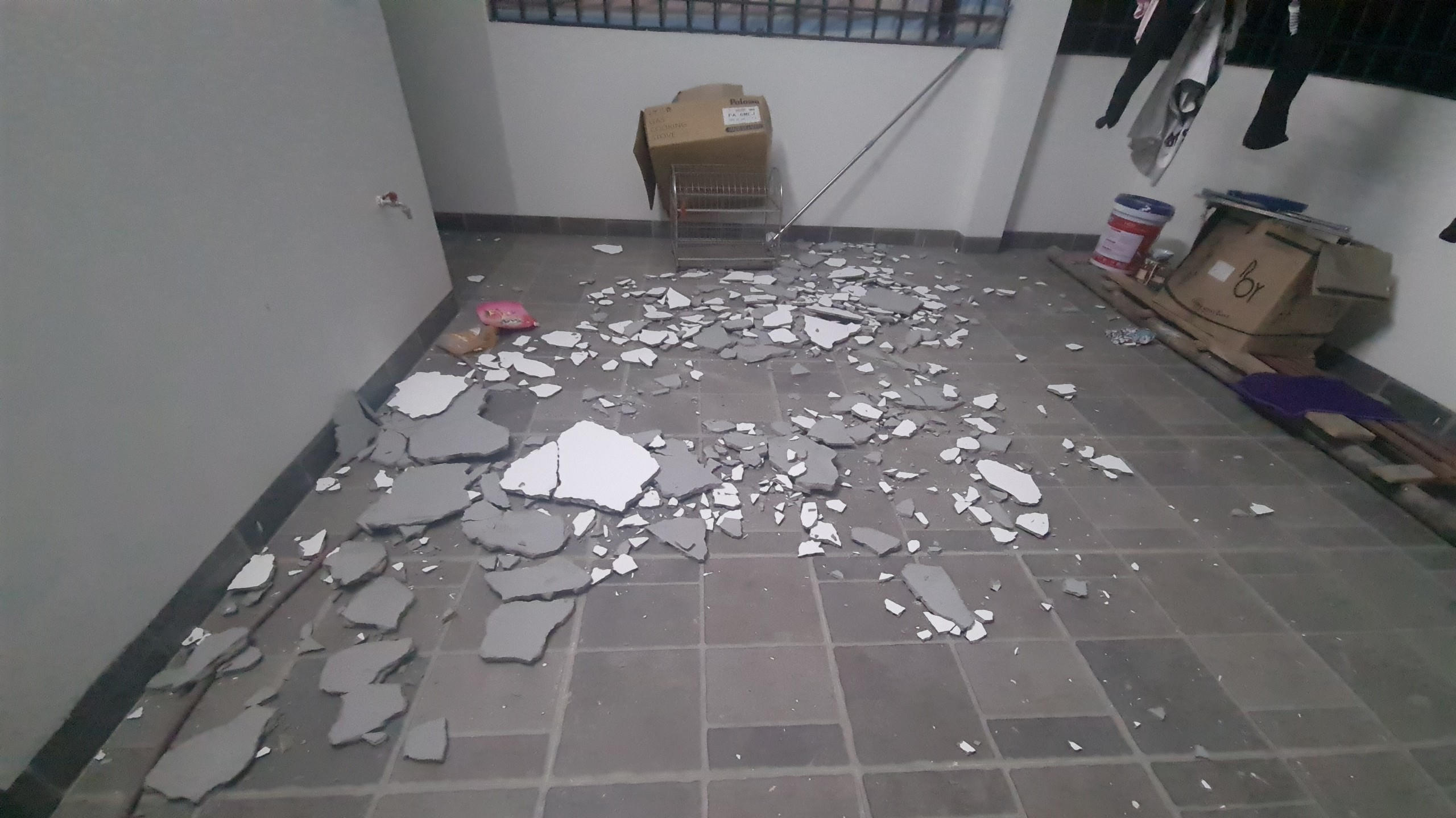 Mảng vữa lớn trên trần nhà bất ngờ rơi xuống khiếnnhững người trong nhà không khỏi bàng hoàng