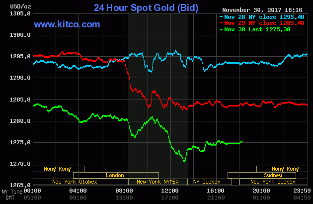 Trên thị trường thế giới, tới đầu giờ sáng 1/12 (giờ Việt Nam), giá vàng giao ngay giảm mạnh về mức 1282 USD/ounce. Giá vàng giao tháng 12 trên sàn Comex New York đứng ở mức 1284 USD/ounce.