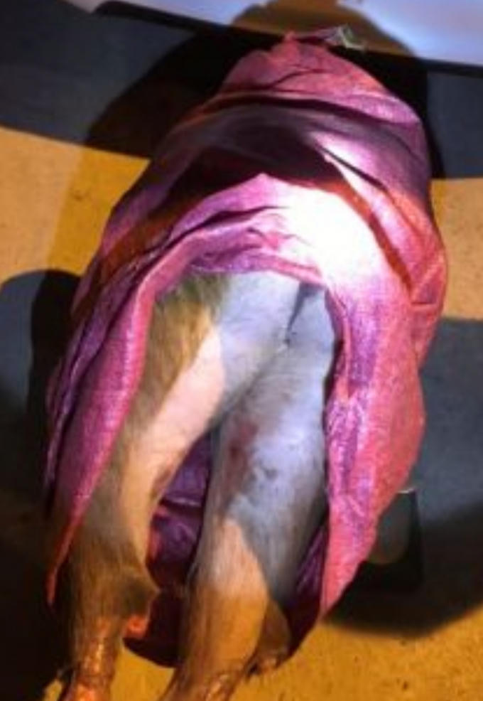 Qua kiểm tra, phát hiện trong cốp phía sau xe có 1 bao bên trong có chứa 2 đùi động vật có lông màu vàng và 1 bao màu xanh bên trong có chứa 2 đùi trước của động vật, có lông màu vàng.