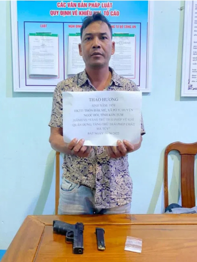 Lực lượng công an sau đó kiểm tra nhà của Thao Hương tại thôn Đắk Mế, xã Pờ Y, thu một gói nylon chứa ma túy đá, hai khẩu súng (một súng ngắn M22 có sẵn hai viên đạn, một khẩu súng kíp) và kiếm, dao găm.