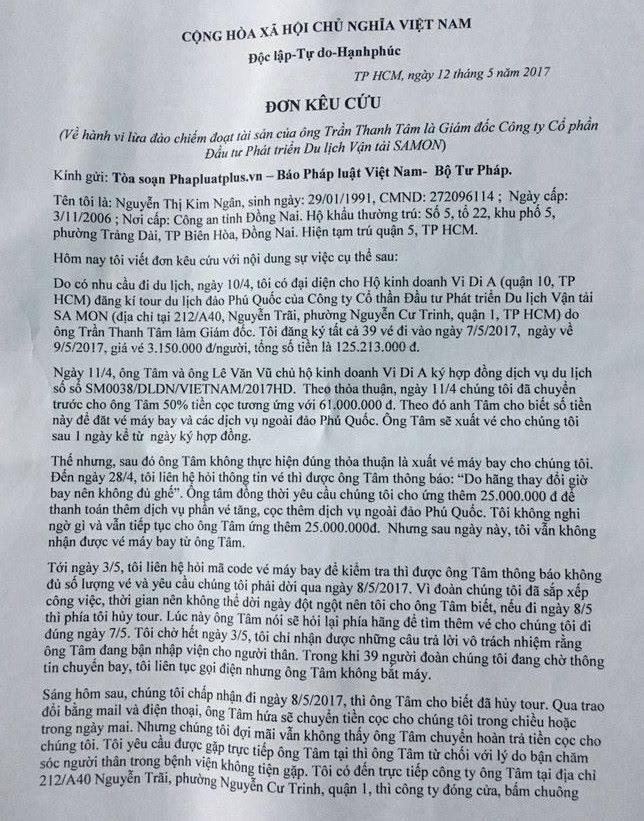 Ngày 10/5, chị Nguyễn Thị Kim Ngân (quận 5, TP HCM) đã tới tòa soạn Pháp luật Plus, gửi đơn tố cáo nêu đích danh Công ty Cổ thần Đầu tư Phát triển Du lịch Vận tải Samon (Công ty Du lịch Samon; địa chỉ tại 212/A40, Nguyễn Trãi, phường Nguyễn Cư Trinh, quận 1, TP HCM) có dấu hiệu lừa đảo, chiếm đoạt tiền của khách thông qua việc bán dịch vụ du lịch.