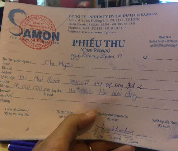 Chị Ngân cho biết, đại diện của Công ty Du lịch Samon là ông Trần Thanh Tâm trực tiếp làm việc với chị Ngân để gửi lịch trình tour du lịch. Ngày 11/4, phía chị Ngân và Công ty Du lịch Samon ký hợp đồng, thỏa thuận phương thức thanh toán tiền là phía Công ty này sẽ nhận trước 50% tiền của phía chị Ngân (61.000.000 đồng). Chị Ngân cho biết đã chuyển số tiền này cho phía công ty.