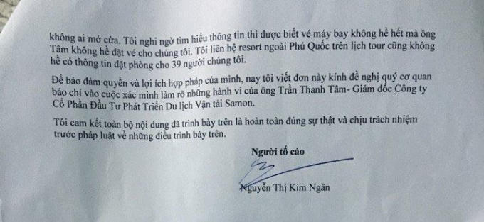 Theo đơn tố cáo, chị Kim Ngân cho biết, do có nhu cầu đi du lịch nên ngày 10/4, chị Ngân thay mặt bạn bè (39 người) liên hệ tới Công ty Du lịch Samon mua dịch vụ du lịch theo tour từ TP HCM ra đảo Phú Quốc, tỉnh Kiên Giang.