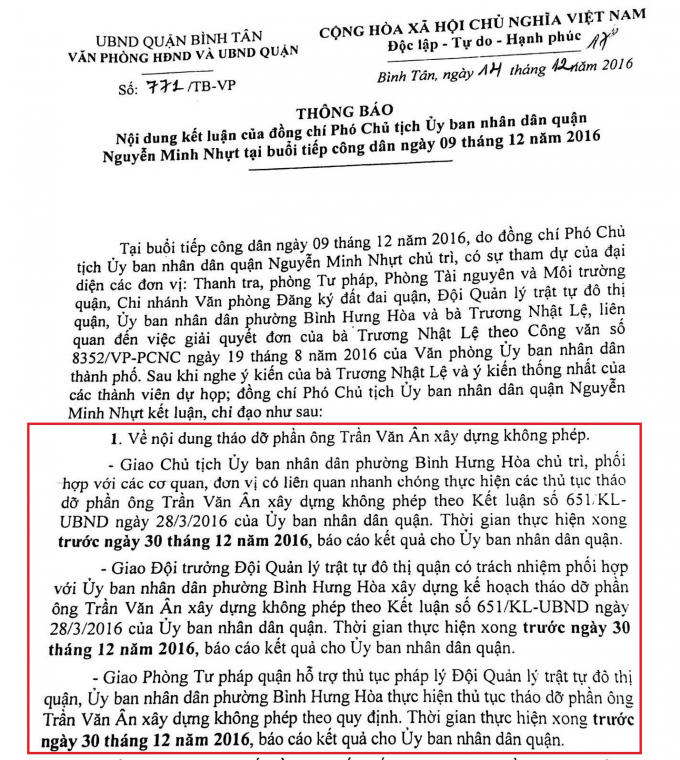 Theo thông báo số 771/TB-VP ngày 14/12/2016 (thông báo số 771) của UBND quận Bình Tân có nội dung: “Về nội dung tháo dỡ phần ông Trần Văn Ân xây dựng không phép. Giao cho Chủ tịch UBND phường Bình Hưng Hòa chủ trì, phối hợp với các cơ quan, đơn vị có liên quan nhanh chóng thực hiện các thủ tục tháo dỡ phần ông Trần Văn Ân xây dựng không phép… Thời gian thực hiện xong trước ngày 30/12/2016”.