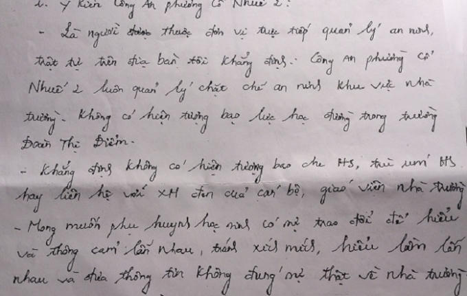Tại cuộc họp giải quyết các vấn đề khúc mắc của phụ huynh liên quan đến việc xử lý học sinh vi phạm nội quy của nhà trường. Thành phần tham dự bao gồm các cán bộ, giáo viên và phụ huynh học sinh và lực lượng công an phường Cổ nhuế 2, Quận Nam Từ Liêm, TP Hà Nội. Trong Biên bản cuộc họp ghi rõ, đại diện công an phường Cổ Nhuế 2 phát biểu ý kiến khẳng định “không có hiện bạo lực học đường trong trường Đoàn Thị Điểm. Không có hiện tượng cán bộ, giáo viên trường THPT Đoàn Thị Điểm bao che cho học sinh, trù úm học sinh hay liên hệ với xã hội đen”.