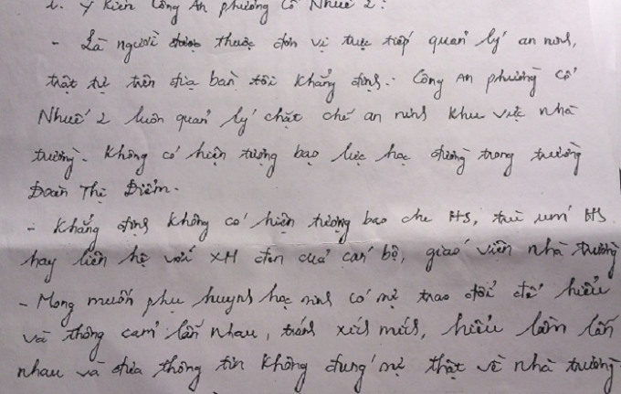 | Ý kiến đánh giá của Công an Phường Cổ Nhuế 2 khẳng định không có bạo lực học đường ở trường Đoàn Thị Điểm. |