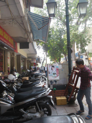 Chị bảo, phố Đinh Lễ có mái hiên khá rộng, dành để che nắng, che mưa cho người đi bộ thì bây giờ lại để che chở cho xe máy, đẩy người đi bộ vào khu vực thiếu an toàn. Bắt buộc để xevào trong rất bất tiện mỗi khi cửa hàng chuyển sách vào cửa hàng.