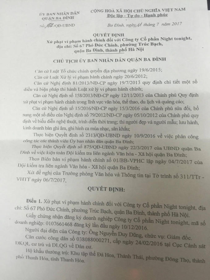 Theo tìm hiểu của PV Pháp luật plus, trong tháng 7 vừa qua, Công ty Cổ phần Night Tonight (Bar F-Club địa chỉ 67 Phó Đức Chính, phường Trúc Bạch, quận Ba Đình, Hà Nội bị UBND quận Ba Đình ra quyết định xử phạt hành chính số 1812/QĐ-UBND ngày 11/7/2017 với mức tiền phạt 4.000.000đ (4 triệu đồng) về hành vi: “Không thông báo bằng văn bản về nội dung chương trình biểu diễn nghệ thuật, trình diễn thời trang đến cơ quan Nhà nước có thẩm quyền nơi biểu diễn, trình diễn theo quy định”.