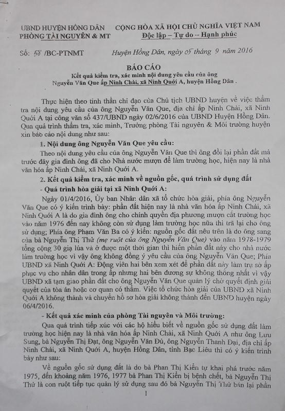 Về yêu cầu của ông Que, Báo cáo của Phòng TN-MT huyện Hồng Dân cho rằng, ông không cung cấp được chứng cứ chứng minh quá trình quản lý sử dụng đất.