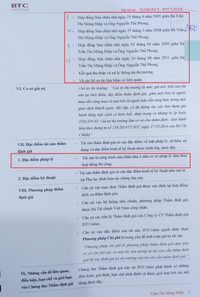 Theo bản thẩm định 915, tổng số tiền thẩm định giá lại lên tới 655 triệu, sau khấu hao còn lại 567.400.000 đồng. Cơ sở pháp lý để thẩm định giá là: Hợp đồng Thi công sửa chữa nhà giữa bà Điệp và cá nhân ông Phong.