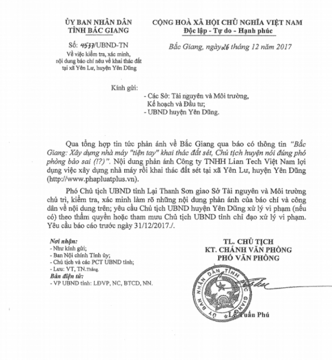 Ngay sau khi có thông tin phản ánh, ngày 26/12/2017, UBND tỉnh Bắc Giang đã ban hành văn bản số 4537/UBND-TN gửi tới Sở Tài nguyên và Môi trường (TNMT), Sở Kế hoạch và Đầu tư cùng UBND huyện Yên Dũng về việc kiểm tra, xác minh nội dung báo chí nêu về khai thác đất tại xã Yên Lư, huyện Yên Dũng.