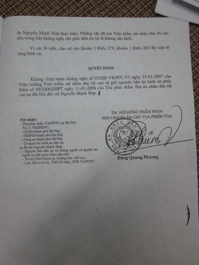 Tháng 1/2006, Tòa phúc thẩm TAND Tối cao y án sơ thẩm… Ông Hợp tiếp tục gửi đơn kêu oan, kèm theo chứng cứ để chứng minh ông không phải là kẻ lừa đảo.