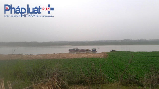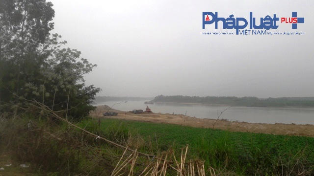 Trên bãi bồi bờ sông, một doanh nghiệp khác cũng đang dùng máy cẩu múc đất ruộng của người dân. Giữa dòng sông, các doanh nghiệp được cấp phép khai thác vẫn hối hả “tận thu” khoáng sản.