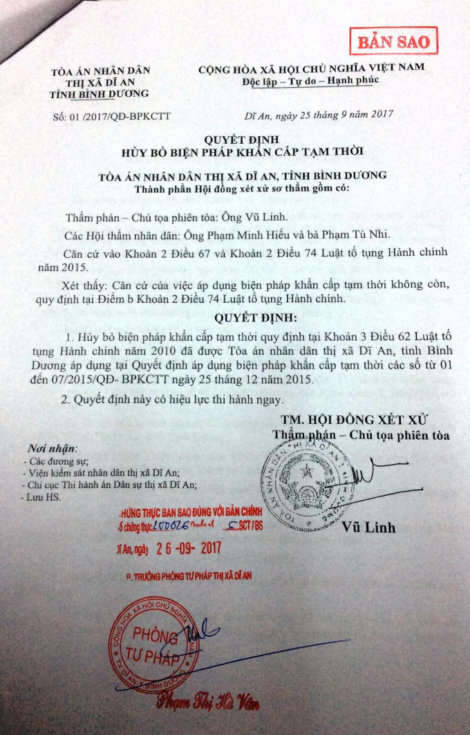 “1. Hủy bỏ biện pháp khẩn cấp tạm thời quy định tại Khoản 3 Điều 62 Luật tố tụng Hành chính năm 2010 đã được Tòa án nhân dân thị xã Dĩ An, tỉnh Bình Dương áp dụng tại Quyết định áp dụng biện pháp khẩn cấp tạm thời các số từ 01 đến 07/2015/QĐ-BPKCTT ngày 25 tháng 12 năm 2015.