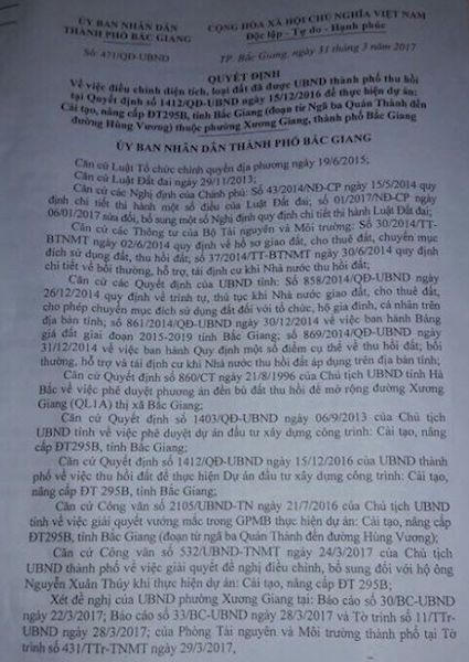 Theo đó, ngày 31/3/2017, UBND TP Bắc Giang đã ban hành Quyết định số 472/QĐ-UBND do ông Nguyễn Văn Thạo - Phó Chủ tịch UBND TP Bắc Giang ký về việc phê duyệt phương án điều chỉnh, bổ sung kinh phí bồi thường, hỗ trợ và giao đất ở tái định cư khi nhà nước thu hồi đất của người dân để thực hiện dự án cái tạo nâng cấp đường tỉnh 295B.