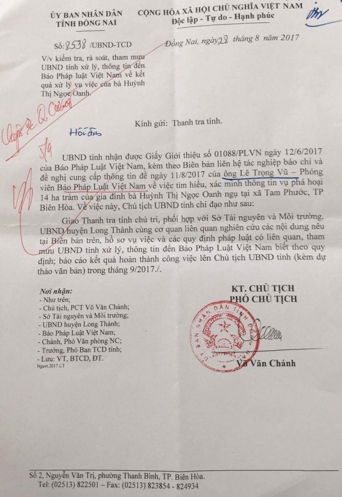 Ngày 28/8/2017, UBND tỉnh Đồng Nai ban hành công văn số 8538/UBND-TCD (công văn số 8538) gửi Thanh tra tỉnh về việc kiểm tra, rà soát, tham mưu UBND tỉnh xử lý, thông tin đến Báo Pháp luật Việt Nam về kết quả xử lý vụ việc của bà Huỳnh Thị Ngọc Oanh.