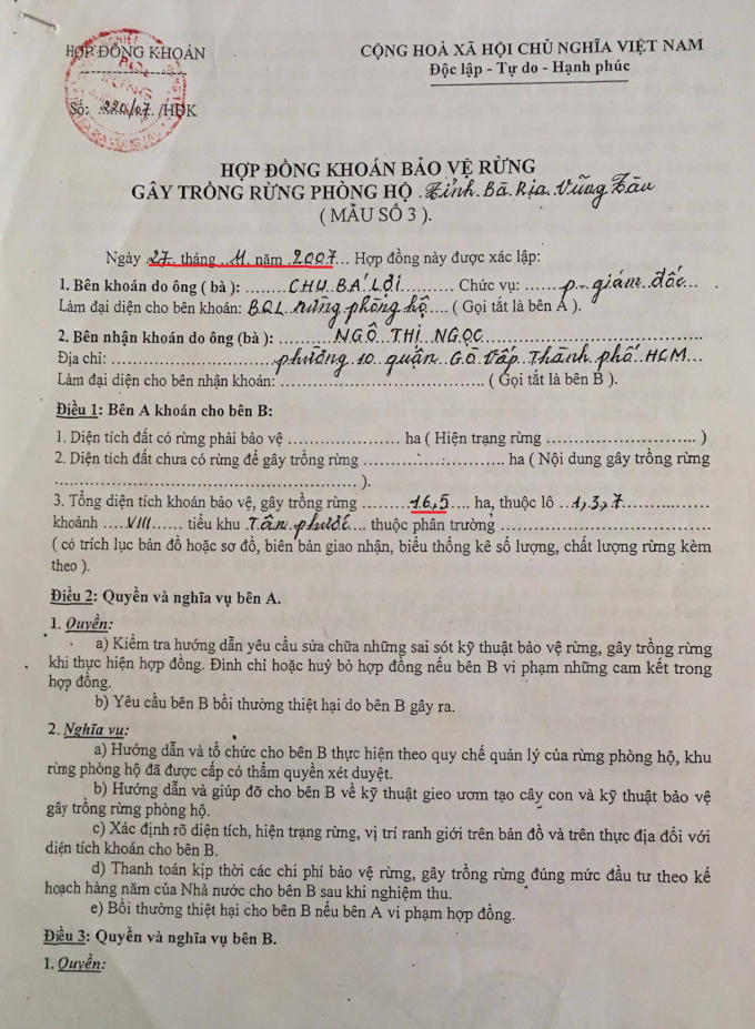 Theo HĐK số 220 thì bà Ngọc được BQL RPH giao 16,5 ha rừng được trồng bằng vốn ngân sách Nhà nước thuộc lô 1,3,7 khoảnh VIII tiểu khu Tân Phước.