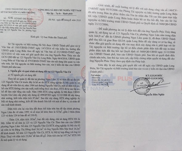 Sở Tài nguyên và Môi Trường cũng đã có văn bản 5214/STNMT-ĐKTKĐĐ ngày 8/6/2016 báo cáo UBND Thành phố về việc giải quyết đề nghị của UBND quận Long Biên tại văn bản số số 251/UBND – TNMT ngày 02/3/2016 về việc xem xét giải quyết đơn của ông Lê Phúc Thủy xin cấp GCN QSD đất.
