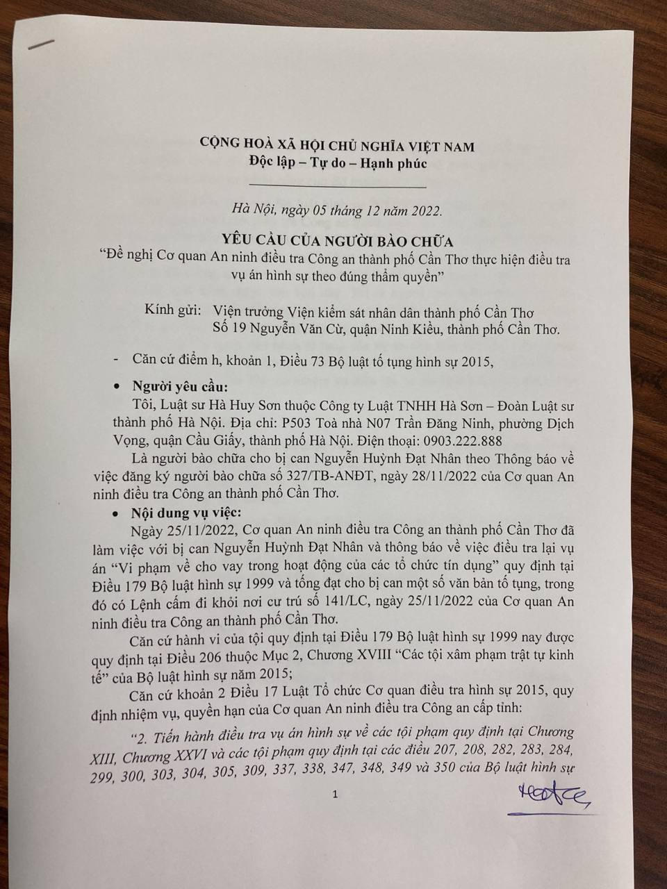 Trong văn bản “Đề nghị Cơ quan An ninh điều tra Công an thành phố Cần Thơ thực hiện điều tra vụ án hình sự theo đúng thẩm quyền” gửi nhiều các cơ quan chức năng, Luật sư Hà Huy Sơn, (Đoàn Luật sư thành phố Hà Nội) cho rằng, ngày 25/11/2022, Cơ quan An ninh điều tra Công an thành phố Cần Thơ đã làm việc với bị can Nguyễn Huỳnh Đạt Nhân và thông báo về việc điều tra lại vụ án “Vi phạm về cho vay trong hoạt động của các tổ chức tín dụng" quy định tại Điều 179 Bộ luật hình sự 1999 và tổng đạt cho bị can một số văn bản tố tụng, trong đó có Lệnh cấm đi khỏi nơi cư trú số 141/LC, ngày 25/11/2022 của Cơ quan An ninh điều tra Công an thành phố Cần Thơ.