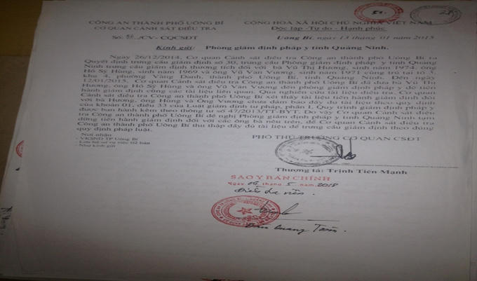 Ngày 12/1/2015, 3 bị hai được đưa đi giám định nhưng ngày 13/1/2015, Thượng tá Trịnh Tiến Mạnh, Phó thủ trưởng CQCSĐT CATP Uông Bí đã ký công văn số 56/CV-CQCSĐT gửi Phòng giám định pháp y tỉnh Quảng Ninh đề nghị tạm dừng tiến hành giám định đối với chị Hương, anh Hưng và anh Vương với lý do, CQCSĐT CATP Uông Bí xét thấy tài liệu tiến hành giám định đối với ba nạn nhân chưa đảm bảo đầy đủ tài liệu theo quy định của khoản 1, Điều 33, Luật Giám định tư pháp.