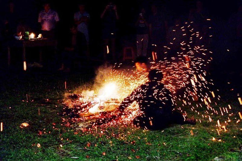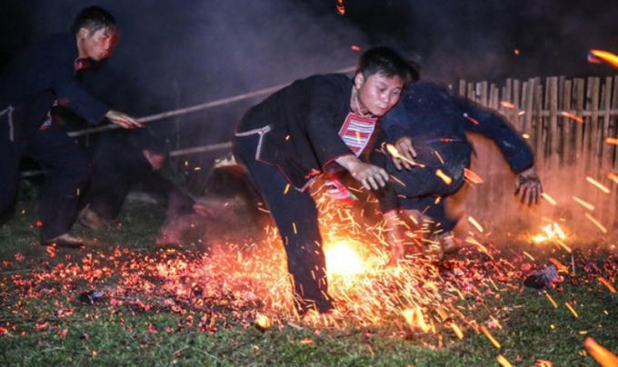 Họ nhảy lò cò trước bàn thờ rồi lao vào giữa đống than lửa đỏ rực. Những chàng trai người Dao Đỏ như đang trong cơn mê say, họ nhảy múa với đôi chân trần của mình trong đống than lửa mà không hề có cảm giác rát bỏng hay sợ hãi.