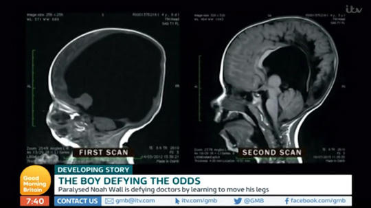 Cậu bé Noah Wall, 6 tuổi, vừa gây ngạc nhiên lớn khi xuất hiện trên các phương tiện truyền thông Anh quốc, bởi 6 năm trước, cậu bé đã ra đời với hộp sọ hầu như không có não.