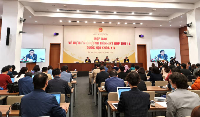 Sáng 23/3, tại Nhà quốc Hội (Hà Nội) đã diễn ra Họp báo về dự kiến chương trình kỳ họp thứ 11, Quốc hội Khoá XIV. Chủ trì họp báo có Đồng chí Nguyễn Hạnh Phúc, Tổng Thư ký Quốc hội - Chủ nhiệm VPQH; Đồng chí Nguyễn Trường Giang, Phó Tổng thư ký QH, PCN UB Pháp luật; Đồng chí Đặng Thuần Phong, Phó Chủ nhiệm Uỷ ban về các vấn đề Xã hội; Đồng chí Nguyễn Tuấn Anh, Phó Trưởng ban Công tác đại biểu; Đồng chí Vũ Minh Tuấn, Phó Chủ nhiệm Văn phòng Quốc hội