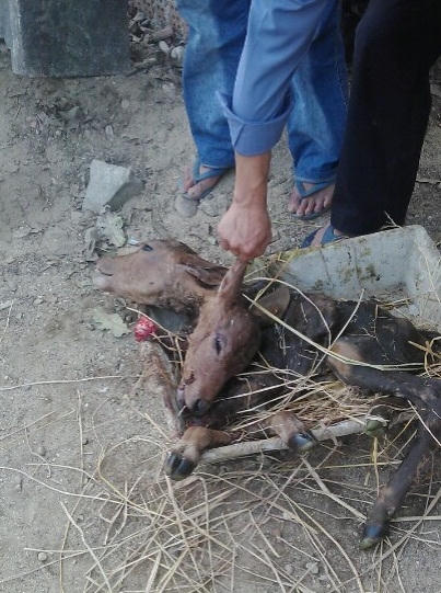 Ông Võ Thiện Sinh, cán bộ Thú y cơ sở cho biết, sau khi thăm khám ông xác định bê con vẫn còn sống nhưng bị dị dạng. Ông Sinh dùng thủ thuật cắt chân bê và kéo bê con ra ngoài, lúc này bê đã chết.
