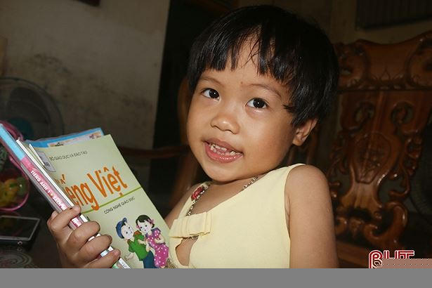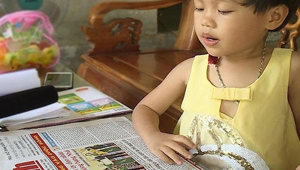 | Chưa được học nhưng bé Khánh Huyền đã có thể đọc sách báo vanh vách (ảnh Báo Hà Tĩnh) |