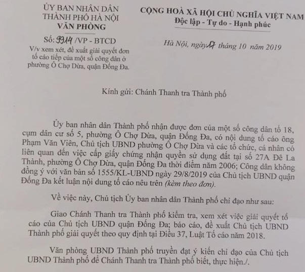 Liên quan đến vụ việc này mới đây Phó Chủ tịch UBND TP Hà Nội Nguyễn Thế Hùng đã ký Quyết định về việc thụ lý và giao nhiệm vụ xác minh nội dung tố cáo của công dân đối với Phó Chủ tịch UBND quận Đống Đa.